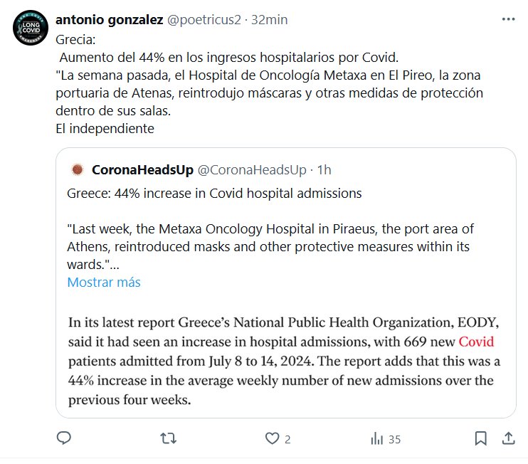 Y EL «FIN DE PANDEMIA»? Grecia: Aumento del 44% en los ingresos hospitalarios por Covid. «La semana pasada, el Hospital de Oncología Metaxa en El Pireo, la zona portuaria de Atenas, reintrodujo máscaras y otras medidas de protección dentro de sus salas.