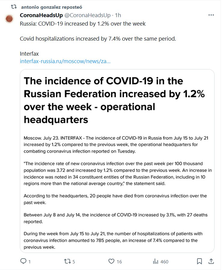 EN INGLÉS Rusia: el COVID-19 aumentó un 1,2% durante la semana Las hospitalizaciones por Covid aumentaron un 7,4% durante el mismo período. Interfax Posted on julio 25, 2024 por coronado