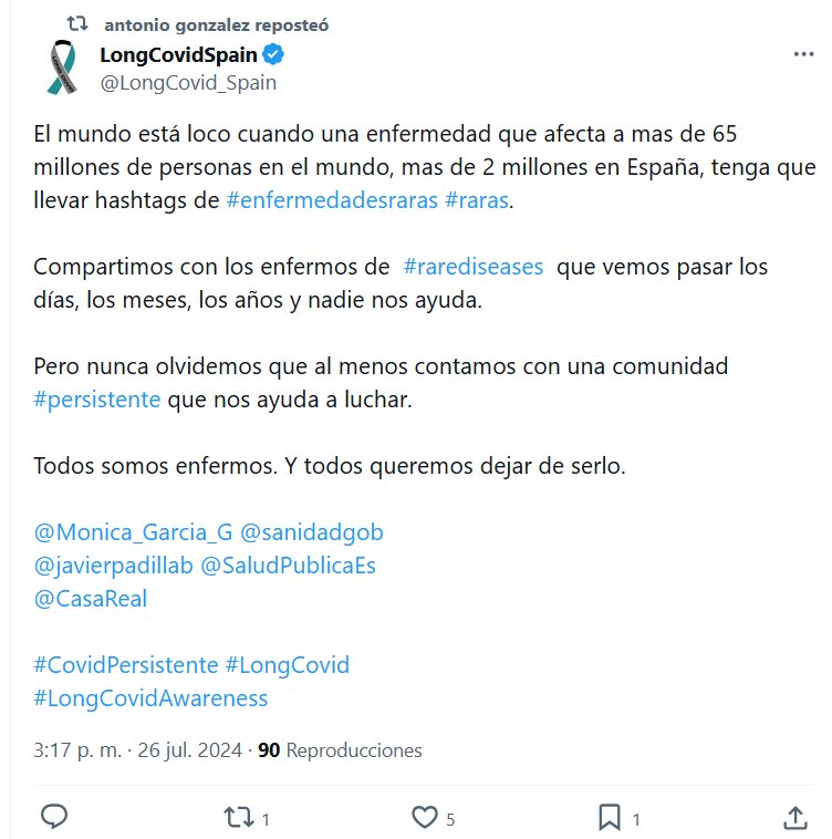 LongCovidSpain @LongCovid_Spain El mundo está loco cuando una enfermedad que afecta a mas de 65 millones de personas en el mundo, mas de 2 millones en España, tenga que llevar hashtags de #enfermedadesraras