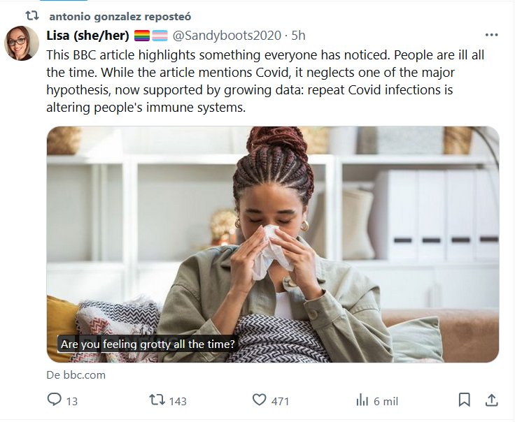 EN INGLÉS Este artículo de la BBC destaca algo que todos hemos notado: la gente está enferma todo el tiempo. Si bien el artículo menciona el Covid, pasa por alto una de las principales hipótesis, ahora respaldada por datos cada vez mayores: las infecciones repetidas por Covid están alterando el sistema inmunológico de las personas.
