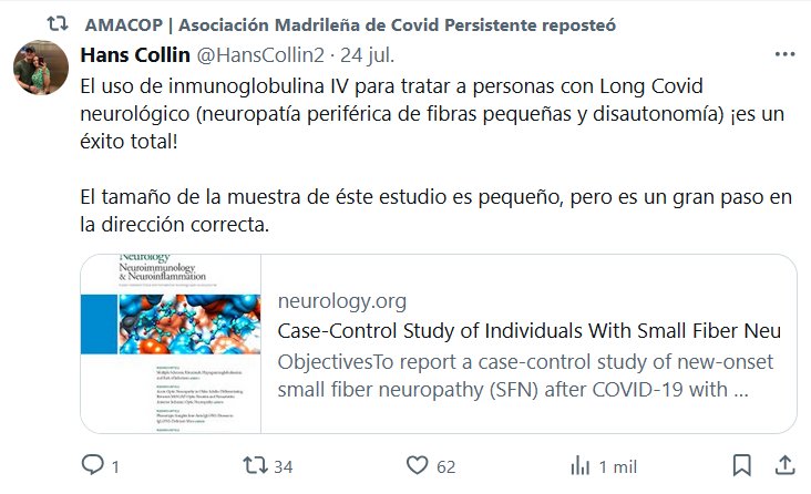 El uso de inmunoglobulina IV para tratar a personas con Long Covid neurológico (neuropatía periférica de fibras pequeñas y disautonomía) ¡es un éxito total! El tamaño de la muestra de éste estudio es pequeño, pero es un gran paso en la dirección correcta.