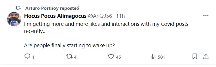 ESCUCHO VOCES (EN INGLÉS) Últimamente, mis publicaciones sobre el Covid me han dado cada vez más «me gusta» e interacciones… ¿La gente por fin está empezando a despertar? Posted on julio 30, 2024 por coronado