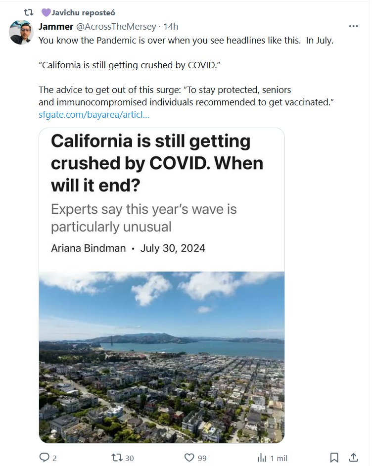 SARCASMO EN INGLÉS Sabes que la pandemia ha terminado cuando ves titulares como este. En julio. “California sigue siendo aplastada por el COVID”. El consejo para salir de esta oleada: “Para mantenerse protegidos, se recomienda que las personas mayores y las personas inmunodeprimidas se vacunen”