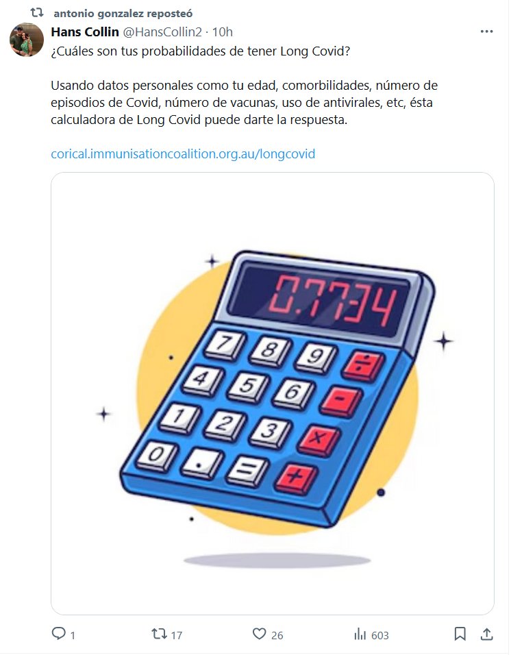 ¿Cuáles son tus probabilidades de tener Long Covid? Usando datos personales como tu edad, comorbilidades, número de episodios de Covid, número de vacunas, uso de antivirales, etc, ésta calculadora de Long Covid puede darte la respuesta
