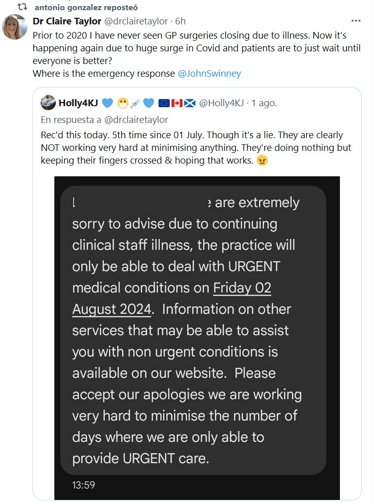 TESTIMONIOS (EN INGLÉS) Dra. Claire Taylor @drclairetaylor Antes de 2020, nunca había visto que los consultorios de médicos de cabecera cerraran debido a enfermedades. Ahora está sucediendo de nuevo debido al gran aumento de casos de Covid y los pacientes deben esperar hasta que todos mejoren. ¿Dónde está la respuesta de emergencia? @JohnSwinney