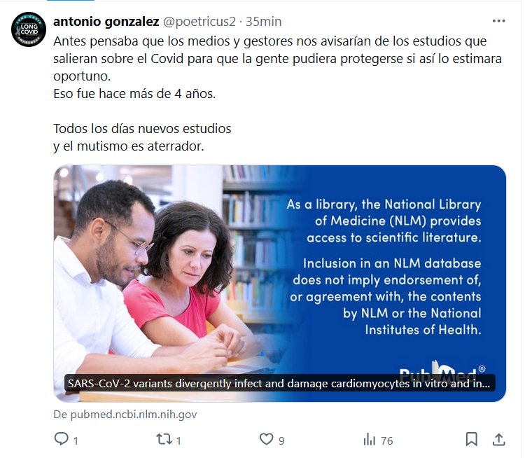 OMERTÁ COVID Antonio González @poetricus2 Antes pensaba que los medios y gestores nos avisarían de los estudios que salieran sobre el Covid para que la gente pudiera protegerse si así lo estimara oportuno. Eso fue hace más de 4 años. Todos los días nuevos estudios y el mutismo es aterrador.