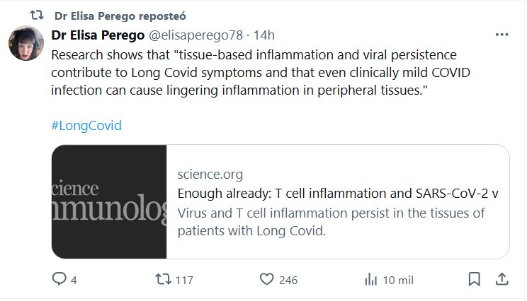 EN INGLÉS Dra. Elisa Perego @elisaperego78 Las investigaciones muestran que «la inflamación tisular y la persistencia viral contribuyen a los síntomas de Covid prolongado y que incluso una infección por COVID clínicamente leve puede causar una inflamación persistente en los tejidos periféricos»