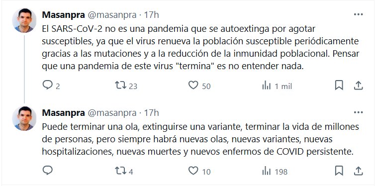 El SARS-CoV-2 no es una pandemia que se autoextinga por agotar susceptibles, ya que el virus renueva la población susceptible periódicamente gracias a las mutaciones y a la reducción de la inmunidad poblacional. Pensar que una pandemia de este virus «termina» es no entender nada Puede terminar una ola, extinguirse una variante, terminar la vida de millones de personas, pero siempre habrá nuevas olas, nuevas variantes, nuevas hospitalizaciones, nuevas muertes y nuevos enfermos de COVID persistente