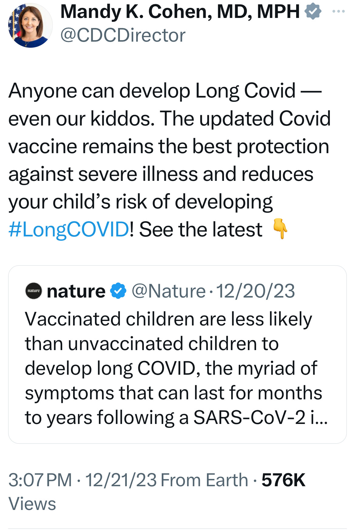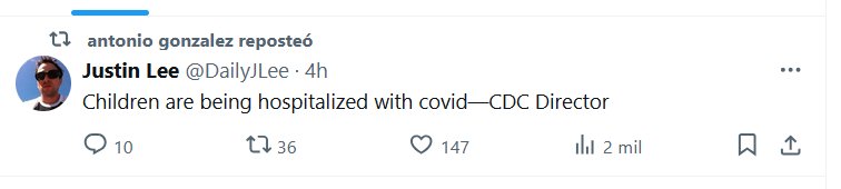 Scott Squires @scott_squires Este es el único tuit que @CDCDirector ha publicado sobre el Covid prolongado. Y se trata del Covid prolongado y los niños, pero ella nunca hace nada para intentar prevenir el Covid prolongado en los niños. La vacuna llegó tarde a la escuela y el año pasado se desvaneció.