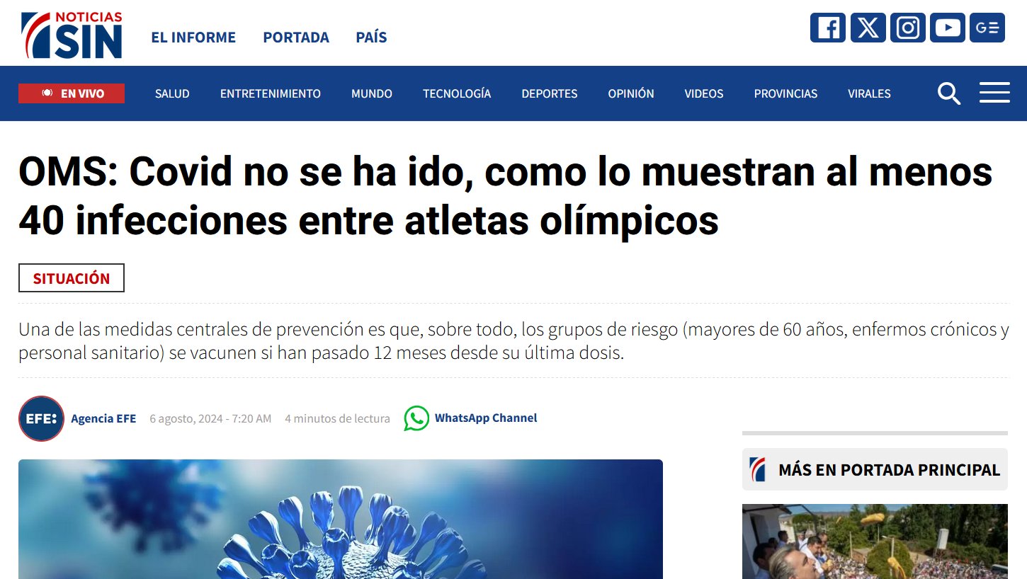 OMS: Covid no se ha ido, como lo muestran al menos 40 infecciones entre atletas olímpicos Posted on agosto 6, 2024 por coronado Una de las medidas centrales de prevención es que, sobre todo, los grupos de riesgo (mayores de 60 años, enfermos crónicos y personal sanitario) se vacunen si han pasado 12 meses desde su última dosis. https://noticiassin.com/oms-covid-no-se-ha-ido-como-lo-muestran-al-menos-40-infecciones-entre-atletas-olimpicos-1694468/ PARA RECORDAR: