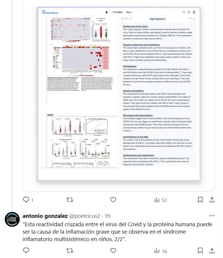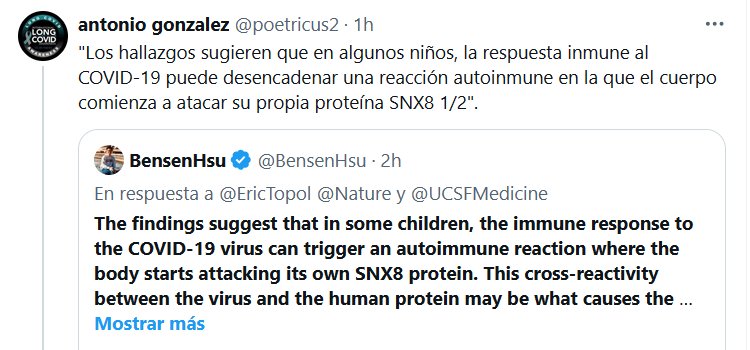 «Los hallazgos sugieren que en algunos niños, la respuesta inmune al COVID-19 puede desencadenar una reacción autoinmune en la que el cuerpo comienza a atacar su propia proteína SNX8 1/2» Posted on agosto 7, 2024 por coronado https://x.com/BensenHsu/status/1821235171229888657