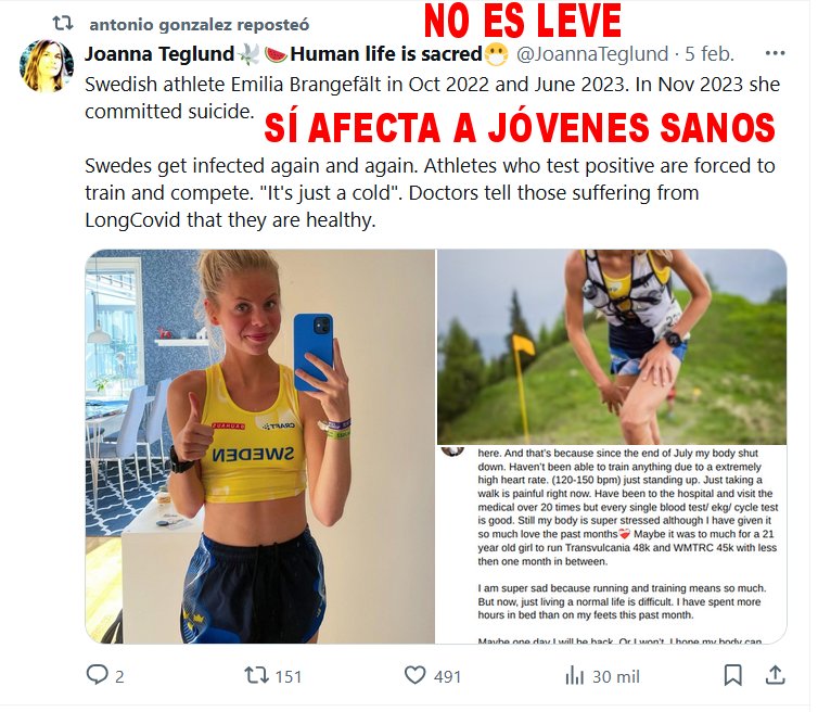 EN INGLÉS La atleta sueca Emilia Brangefält murió en octubre de 2022 [COVID LA MATÓ EN VIDA, LA POSTRÓ CON LONGCOVID] y junio de 2023 [SE SUICIDÓ POR EL LONGCOVID]. En noviembre de 2023 se suicidó. Los suecos se infectan una y otra vez. Los atletas que dan positivo se ven obligados a entrenar y competir. «Es solo un resfriado». Los médicos les dicen a los que sufren LongCovid que están sanos.
