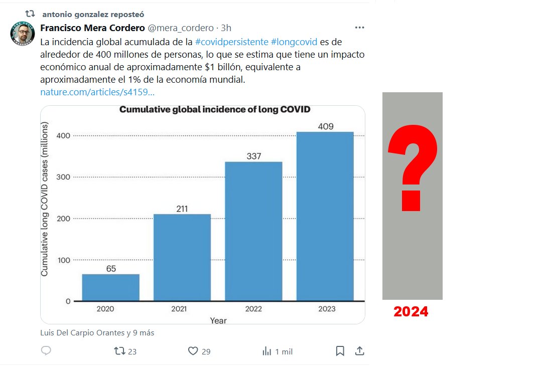 NATURE.COM La incidencia global acumulada de la #covidpersistente #longcovid es de alrededor de 400 millones de personas, lo que se estima que tiene un impacto económico anual de aproximadamente $1 billón, equivalente a aproximadamente el 1% de la economía mundial.