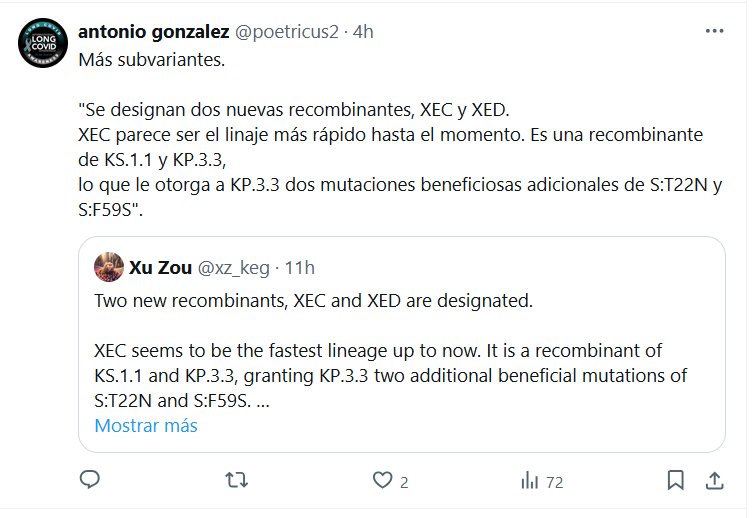 Y AHORA PASAMOS DE LA KA A LA EQUIS Más subvariantes. «Se designan dos nuevas recombinantes, XEC y XED. XEC parece ser el linaje más rápido hasta el momento. Es una recombinante de KS.1.1 y KP.3.3, lo que le otorga a KP.3.3 dos mutaciones beneficiosas adicionales de S:T22N y S:F59S»