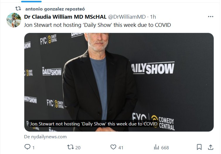EN INGLÉS Dra. Claudia William MD MScHAL @DrWilliamMD Jon Stewart no presentará el programa ‘Daily Show’ esta semana debido al COVID Posted on agosto 11, 2024 por coronado