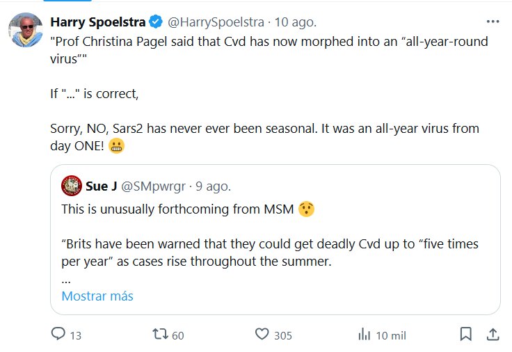 EN INGLÉS «La profesora Christina Pagel dijo que el ECV se ha transformado en un «virus que está presente todo el año» «… Lo siento, NO, el Sars2 nunca ha sido estacional. ¡Fue un virus que está presente todo el año desde el primer día! 😬