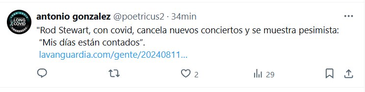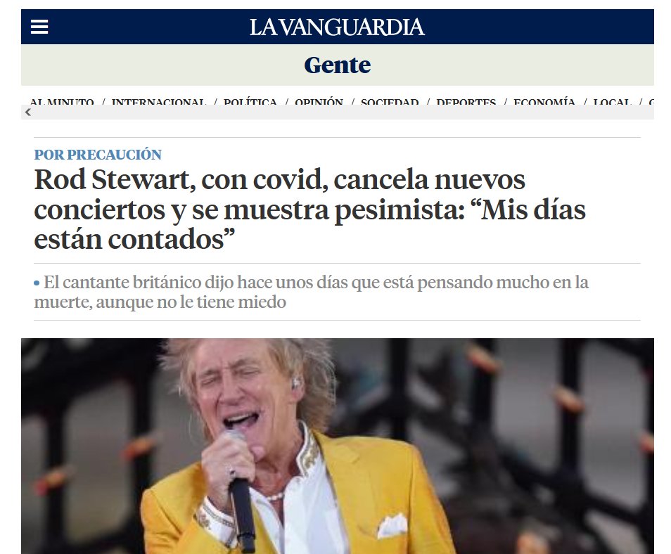 «Rod Stewart, con covid, cancela nuevos conciertos y se muestra pesimista: “Mis días están contados” Posted on agosto 11, 2024 por coronado https://www.lavanguardia.com/gente/20240811/9864800/rod-stewart-covid-cancela-nuevos-conciertos-muestra-pesimista-mis-dias-contados-pmv.amp.html