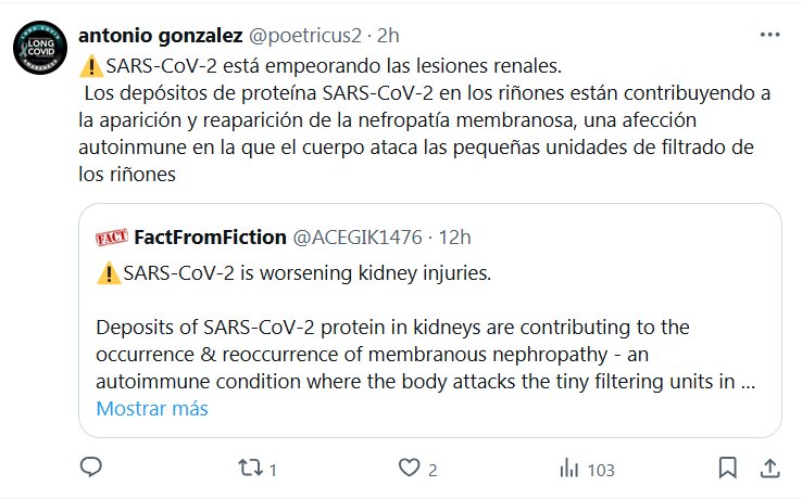 ⚠️SARS-CoV-2 está empeorando las lesiones renales. Los depósitos de proteína SARS-CoV-2 en los riñones están contribuyendo a la aparición y reaparición de la nefropatía membranosa, una afección autoinmune en la que el cuerpo ataca las pequeñas unidades de filtrado de los riñones