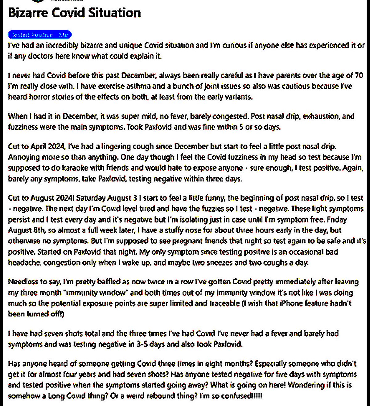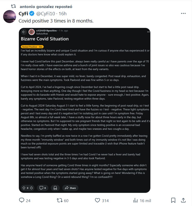 TESTIMONIOS (EN INGLÉS) Covid positivo 3 veces en 8 meses Posted on agosto 12, 2024 por coronado TEXTO (EN INGLÉS):