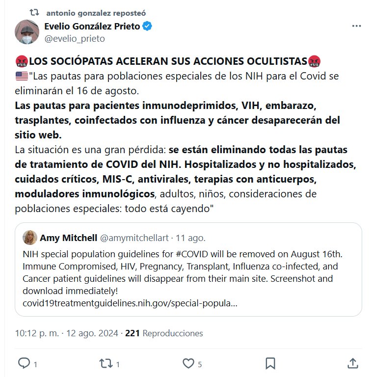 🤬LOS SOCIÓPATAS ACELERAN SUS ACCIONES OCULTISTAS🤬 🇺🇸»Las pautas para poblaciones especiales de los NIH para el Covid se eliminarán el 16 de agosto. Las pautas para pacientes inmunodeprimidos, VIH, embarazo, trasplantes, coinfectados con influenza y cáncer desaparecerán del sitio web.