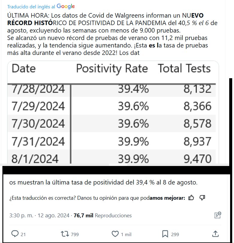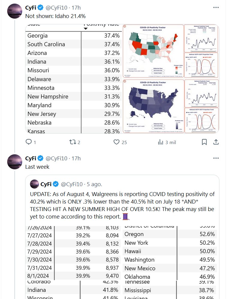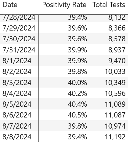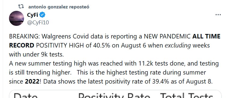 Y EL FIN DE PANDEMIA? (EN INGLÉS) ÚLTIMA HORA: Los datos de Walgreens Covid informan un NUEVO MÁXIMO RÉCORD DE POSITIVIDAD DE TODOS LOS TIEMPOS DE LA PANDEMIA del 40,5% el 6 de agosto al excluir semanas con menos de 9.000 pruebas. Se alcanzó un nuevo máximo de pruebas de verano con 11,2 mil pruebas realizadas, y las pruebas aún tienen una tendencia al alza. ¡Esta es la tasa de pruebas más alta durante el verano desde 2022! Los datos muestran la última tasa de positividad del 39,4% al 8 de agosto