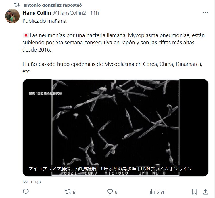 POSTCOVID HACE ESTRAGOS Publicado mañana. 🇯🇵Las neumonías por una bacteria llamada, Mycoplasma pneumoniae, están subiendo por 5ta semana consecutiva en Japón y son las cifras más altas desde 2016. El año pasado hubo epidemias de Mycoplasma en Corea, China, Dinamarca, etc.
