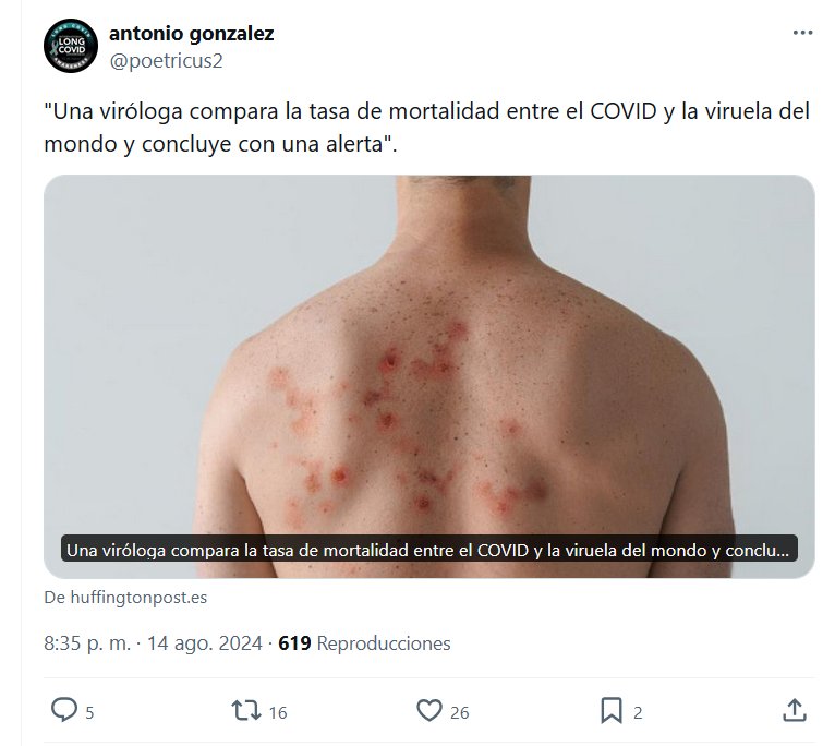 COVID EN SUS PRINCIPIOS: la tasa de letalidad era del 1,2% – MPOX CLADO I : letalidad oscila entre el 3% y el 4% Posted on agosto 15, 2024 por coronado https://www.huffingtonpost.es/sociedad/una-virologa-compara-tasa-mortalidad-covid-viruela-mondo-concluye-alerta.html