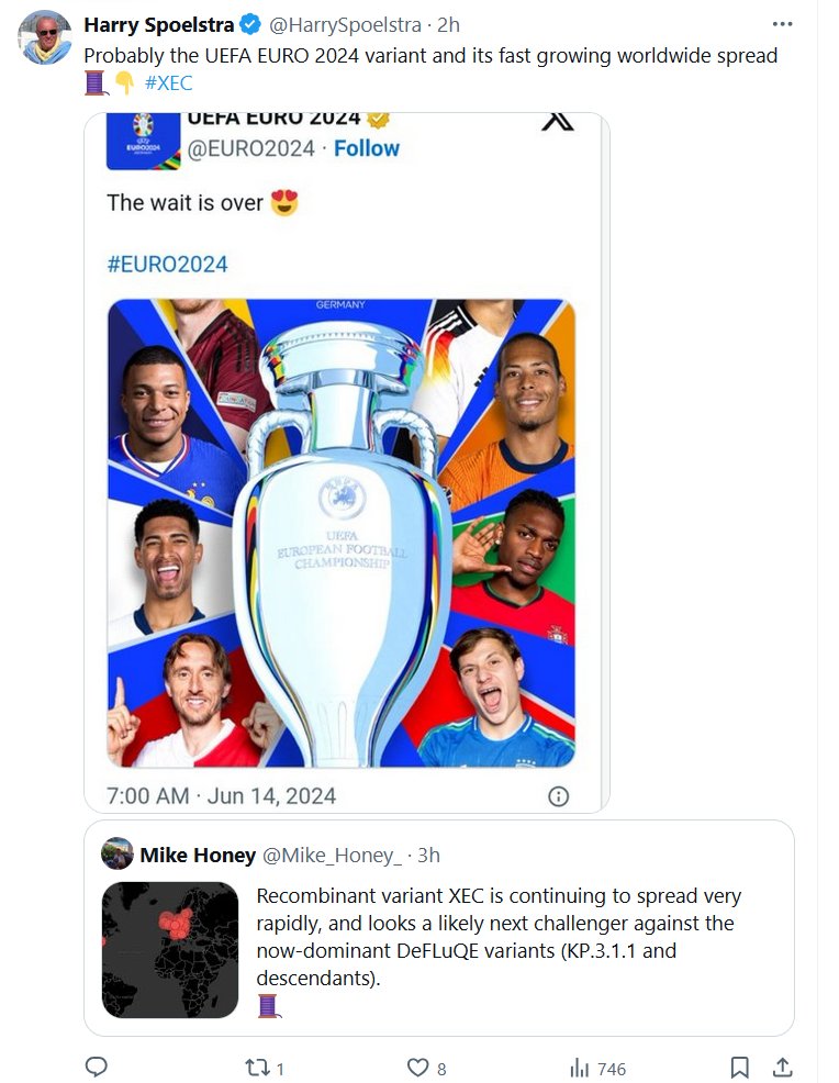 EN INGLÉS La variante recombinante XEC continúa propagándose muy rápidamente y parece ser el próximo rival probable de las variantes DeFLuQE ahora dominantes (KP.3.1.1 y descendientes) Posted on agosto 17, 2024 por coronado https://x.com/Mike_Honey_/status/1824759622101840041