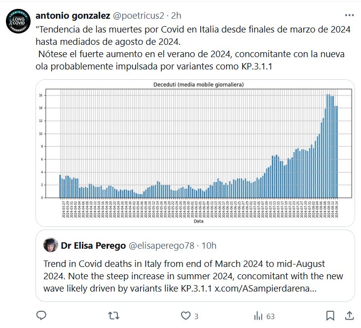 FIN DE PANDEMIA? Tendencia de las muertes por Covid en Italia desde finales de marzo de 2024 hasta mediados de agosto de 2024. Nótese el fuerte aumento en el verano de 2024, concomitante con la nueva ola probablemente impulsada por variantes como KP.3.1.1