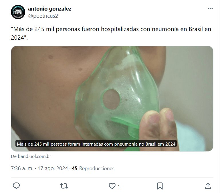 PREGUNTA COVIDIOTA: A QUÉ SE DEBERÁ? «Más de 245 mil personas fueron hospitalizadas con neumonía en Brasil en 2024» Posted on agosto 17, 2024 por coronado https://www.band.uol.com.br/noticias/jornal-da-band/ultimas/mais-de-245-mil-pessoas-foram-internadas-com-pneumonia-no-brasil-em-2024-202408142001?ai=