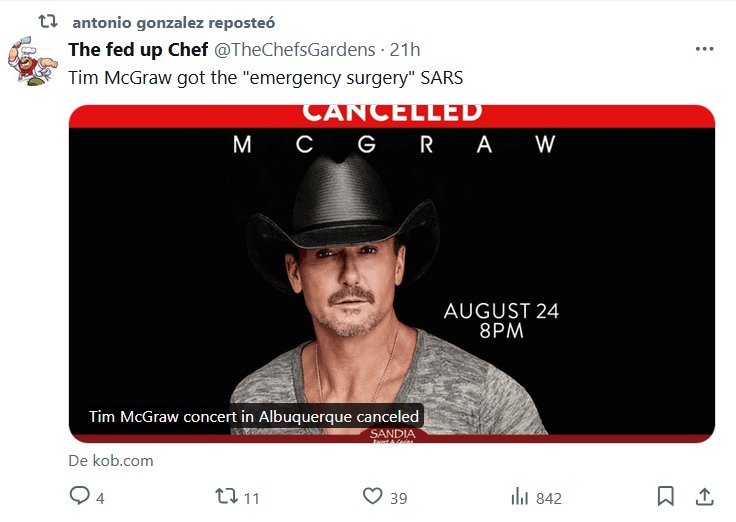 EN INGLÉS Tim McGraw recibió la «cirugía de emergencia» del SARS (POR SARS?) Posted on agosto 18, 2024 por coronado