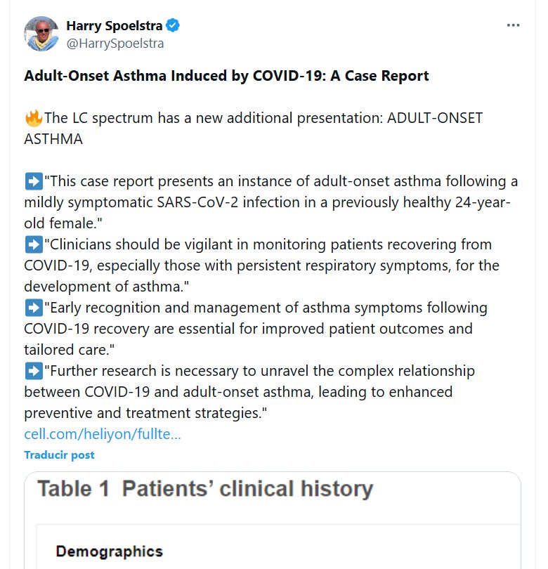EN INGLÉS Asma de inicio en la edad adulta inducida por COVID-19: informe de un caso 🔥El espectro LC tiene una nueva presentación adicional: ASMA DE INICIO EN LA ADULTEZ ➡️»Este informe de caso presenta un caso de asma de inicio en la edad adulta luego de una infección por SARS-CoV-2 levemente sintomática en una mujer de 24 años previamente sana»
