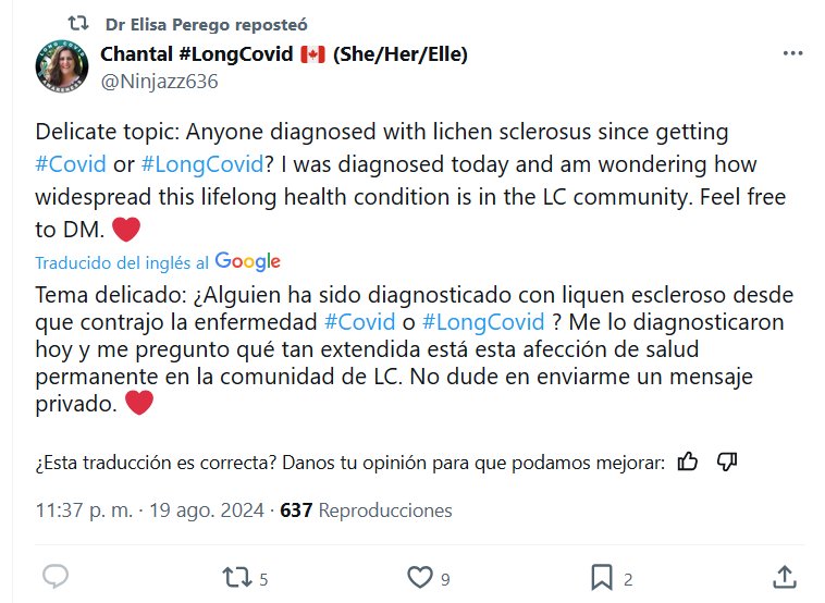DrA. Elisa Perego reposteó Chantal #LongCovid 🇨🇦 (She/Her/Elle) @Ninjazz636 Tema delicado: ¿Alguien ha sido diagnosticado con liquen escleroso desde que contrajo la enfermedad #Covid o #LongCovid ? Me lo diagnosticaron hoy y me pregunto qué tan extendida está esta afección de salud permanente en la comunidad de LC. No dude en enviarme un mensaje privado. ❤️