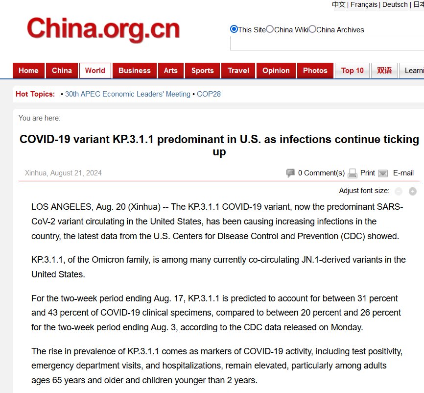 EN INGLÉS La variante KP.3.1.1 de COVID-19 predomina en EE. UU. mientras las infecciones siguen aumentando Posted on agosto 20, 2024 por coronado http://www.china.org.cn/world/Off_the_Wire/2024-08/21/content_117378479.htm