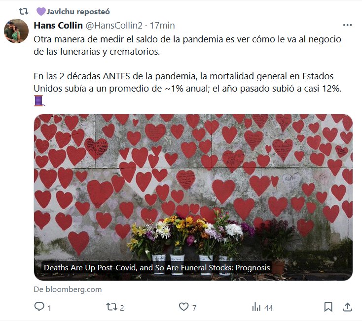 LA ÚNICA VERDAD SIGUE SIENDO LA REALIDAD Otra manera de medir el saldo de la pandemia es ver cómo le va al negocio de las funerarias y crematorios. En las 2 décadas ANTES de la pandemia, la mortalidad general en Estados Unidos subía a un promedio de ~1% anual; el año pasado subió a casi 12%