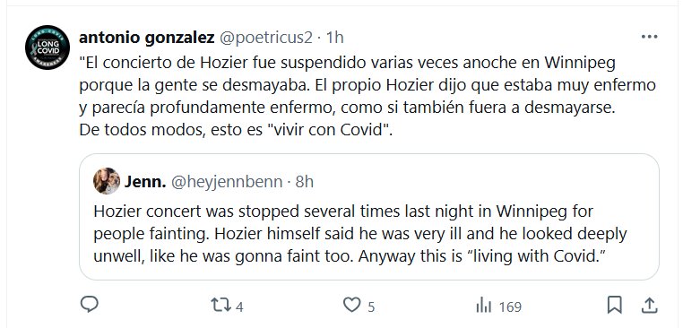 «El concierto de Hozier fue suspendido varias veces anoche en Winnipeg porque la gente se desmayaba. El propio Hozier dijo que estaba muy enfermo y parecía profundamente enfermo, como si también fuera a desmayarse. De todos modos, esto es «vivir con Covid»