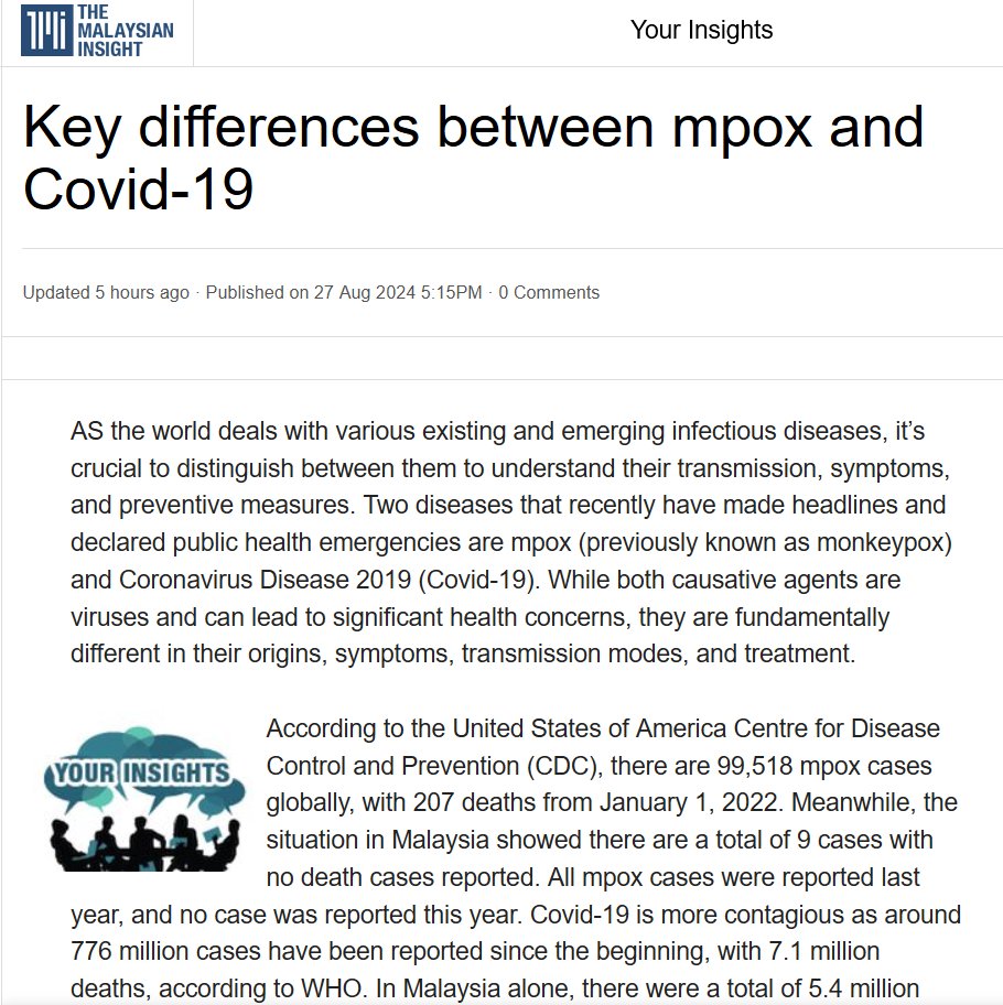EN INGLÉS Diferencias clave entre mpox y Covid-19 Posted on agosto 27, 2024 por coronado https://www.themalaysianinsight.com/index.php/s/487014
