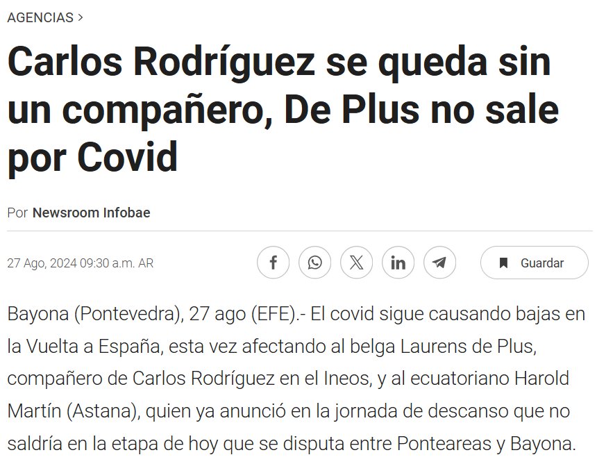 VUELTA DE ESPAÑA Carlos Rodríguez se queda sin un compañero, De Plus no sale por Covid Posted on agosto 27, 2024 por coronado https://www.infobae.com/america/agencias/2024/08/27/carlos-rodriguez-se-queda-sin-un-companero-de-plus-no-sale-por-covid/