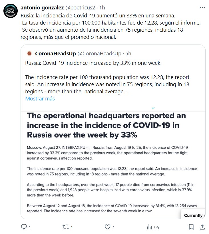 BIOWAR Rusia: la incidencia de Covid-19 aumentó un 33% en una semana. La tasa de incidencia por 100.000 habitantes fue de 12,28, según el informe. Se observó un aumento de la incidencia en 75 regiones, incluidas 18 regiones, más que el promedio nacional