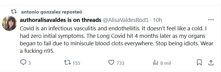 EN INGLÉS El Covid es una vasculitis y endotelitis infecciosa. No se parece a un resfriado. Al principio no tuve ningún síntoma. El Covid prolongado llegó cuatro meses después, cuando mis órganos empezaron a fallar debido a minúsculos coágulos de sangre por todas partes. Dejen de ser idiotas. Usen una maldita mascarilla N95