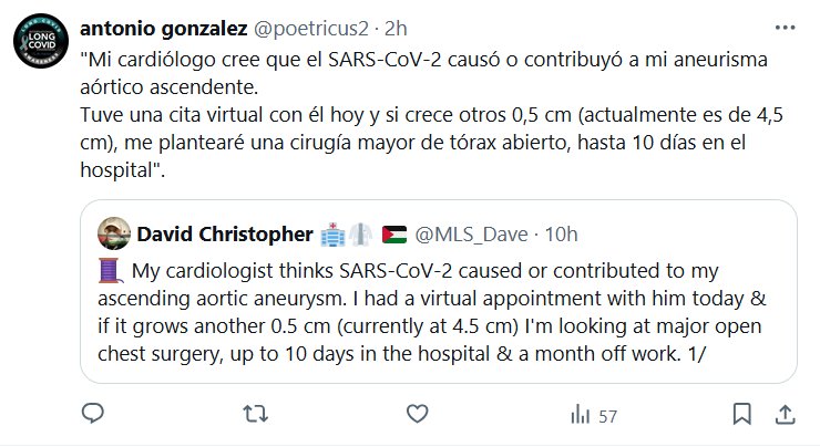 TESTIMONIOS «Mi cardiólogo cree que el SARS-CoV-2 causó o contribuyó a mi aneurisma aórtico ascendente. Tuve una cita virtual con él hoy y si crece otros 0,5 cm (actualmente es de 4,5 cm), me plantearé una cirugía mayor de tórax abierto, hasta 10 días en el hospital»