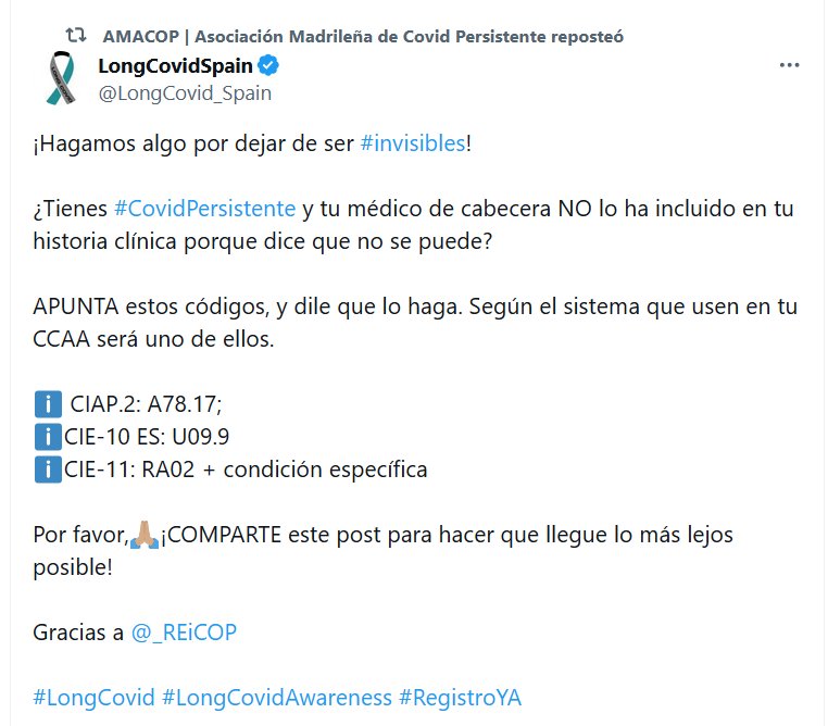 ESPAÑA AMACOP | Asociación Madrileña de Covid Persistente reposteó LongCovidSpain @LongCovid_Spain ¡Hagamos algo por dejar de ser #invisibles! ¿Tienes #CovidPersistente y tu médico de cabecera NO lo ha incluido en tu historia clínica porque dice que no se puede? APUNTA estos códigos, y dile que lo haga.