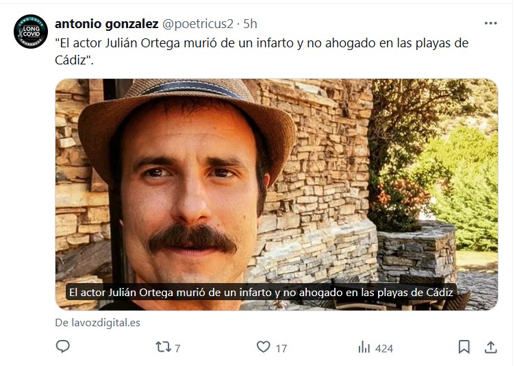 EXTRAÑAS MUERTES EN LA ERA COVID «El actor Julián Ortega murió de un infarto y no ahogado en las playas de Cádiz» Posted on agosto 29, 2024 por coronado