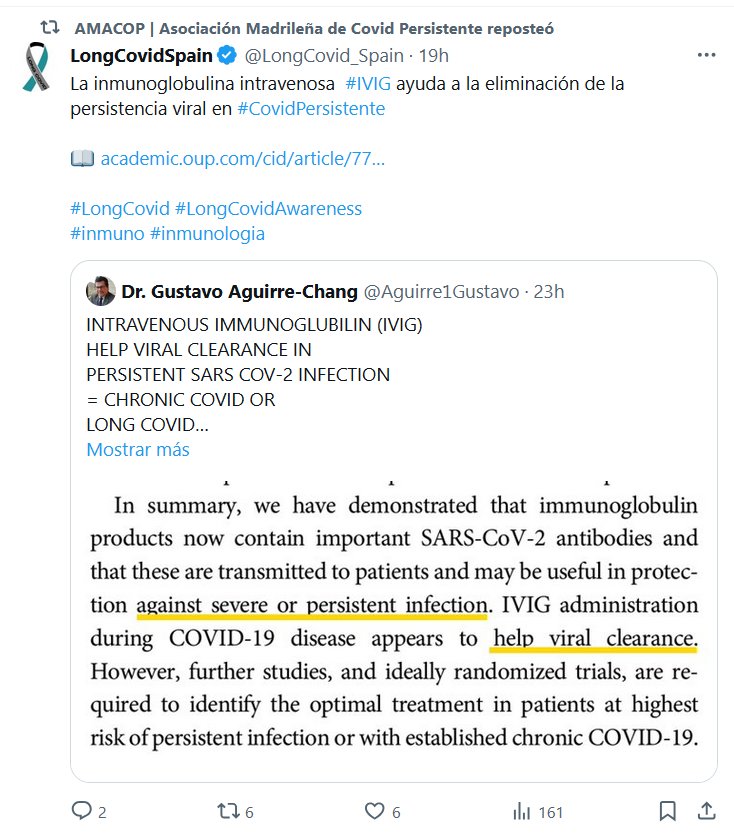 LongCovidSpain @LongCovid_Spain · La inmunoglobulina intravenosa #IVIG ayuda a la eliminación de la persistencia viral en #CovidPersistente