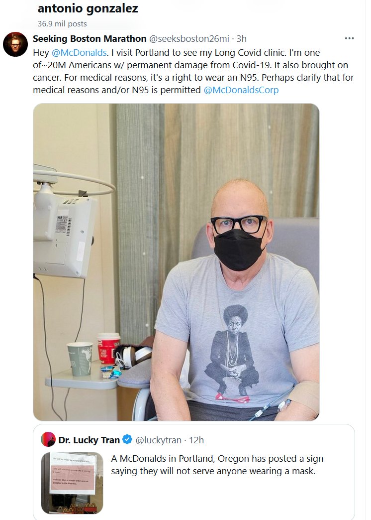 UN MCDONALDS PROHIBIÓ LA MASCARILLA (EN INGLÉS) Hola @McDonalds . Visito Portland para ver mi clínica de Covid prolongado. Soy uno de los ~20 millones de estadounidenses con daño permanente por Covid-19. También provocó cáncer. Por razones médicas, es un derecho usar un N95. Quizás sea mejor aclarar que por razones médicas y/o el N95 está permitido @McDonaldsCorp