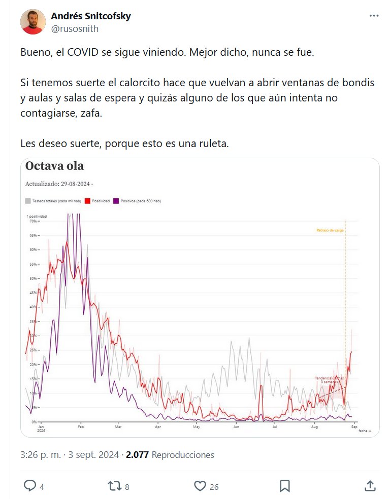 Andrés Snitcofsky @rusosnith Bueno, el COVID se sigue viniendo. Mejor dicho, nunca se fue. Si tenemos suerte el calorcito hace que vuelvan a abrir ventanas de bondis y aulas y salas de espera y quizás alguno de los que aún intenta no contagiarse, zafa. Les deseo suerte, porque esto es una ruleta