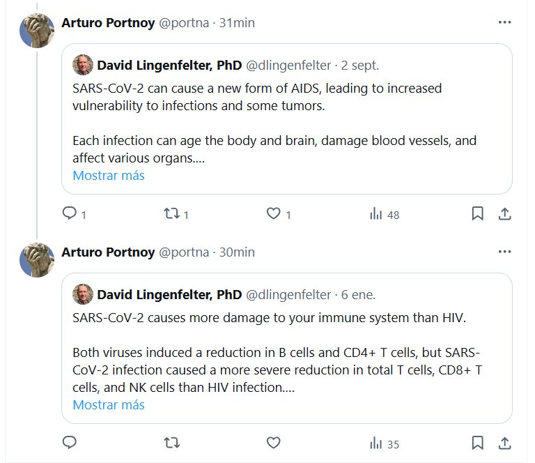 COVID≠GRIPE -> COVID≈SIDA (EN INGLÉS) DR. David Lingenfelter, PhD @dlingenfelter El SARS-CoV-2 causa más daño al sistema inmunológico que el VIH. Ambos virus indujeron una reducción de las células B y de las células T CD4+, pero la infección por SARS-CoV-2 causó una reducción más grave de las células T totales, las células T CD8+ y las células NK que la infección por VIH