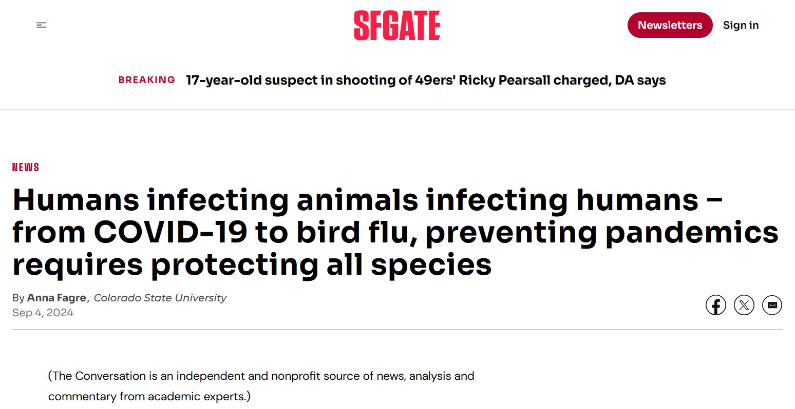 EN INGLÉS Los humanos infectan a los animales y estos infectan a los humanos: desde la COVID-19 hasta la gripe aviar, prevenir pandemias requiere proteger a todas las especies Posted on septiembre 4, 2024 por coronado https://www.sfgate.com/news/article/humans-infecting-animals-infecting-humans-19741898.php