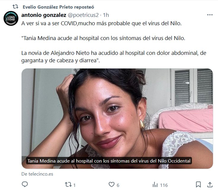 ESTABLISHMENT Y SU OMERTÁ COVID: CUALQUIER COSA MENOS CORONAVIRUS! A ver si va a ser COVID,mucho más probable que el virus del Nilo. «Tania Medina acude al hospital con los síntomas del virus del Nilo. La novia de Alejandro Nieto ha acudido al hospital con dolor abdominal, de garganta y de cabeza y diarrea».
