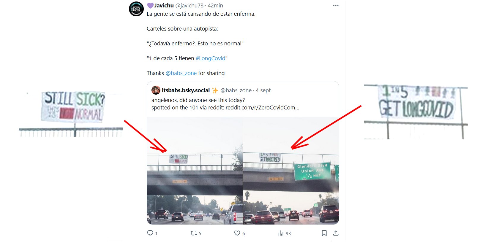 EN INGLÉS La gente se está cansando de estar enferma. Carteles sobre una autopista: «¿Todavía enfermo?. Esto no es normal» «1 de cada 5 tienen #LongCovid» TUITEARON: Angelinos [HABITANTES DE LOS ÁNGELES], ¿alguien vio esto hoy?